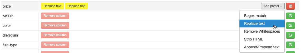 You can then use the parser to edit any columns of data from the web pages you scrape. For example, we use the parser to remove non-numeric characters like “$” or “.” from pricing data through text replacement and also to obtain only the state acronyms from the seller-location address through a regex match.