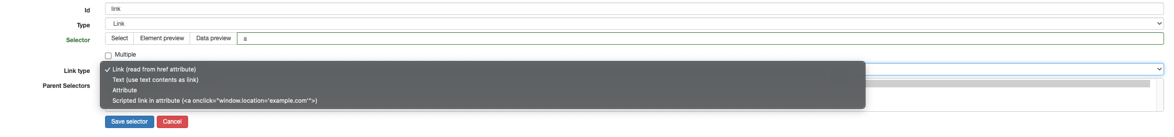 To start off with, the biggest update - Link Selector. Now, not only can this be used to extract data from structured links, but also be applied to elements, where the link can be found within an attribute or as text. To do so, create a Link Selector as usual and, if the link is not nested in a conventional way, select the appropriate option from the 'Link Type' dropdown below.